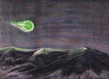 green_fireballs_LIFEOne night Dad was working late on the computers, which was nothing unusual for him, when the dogs started acting strange. Dogs that would growl to get out when Cougars got on the roof were now trying to crawl under the TV and couch and the rock solid stone house started vibrating. Mom went to use the phone to call dad and the line was dead so Mom told Helen to go get the rifle out of the bedroom down the hall and as she was coming back she yelled and Mom and I ran to look. Out the window in the door at the end of the hall we could see a green fireball sitting in the night sky far out in the desert. As we watched it slowly dropped closer to the ground and stopped and a green beam went from the ball to the ground. The beam shot back into the light and the fireball streaked off to the east faster than a rocket. as soon as it was gone the house stopped vibrating, the dogs went back to normal and the phone worked again, everything was normal except our nerves.