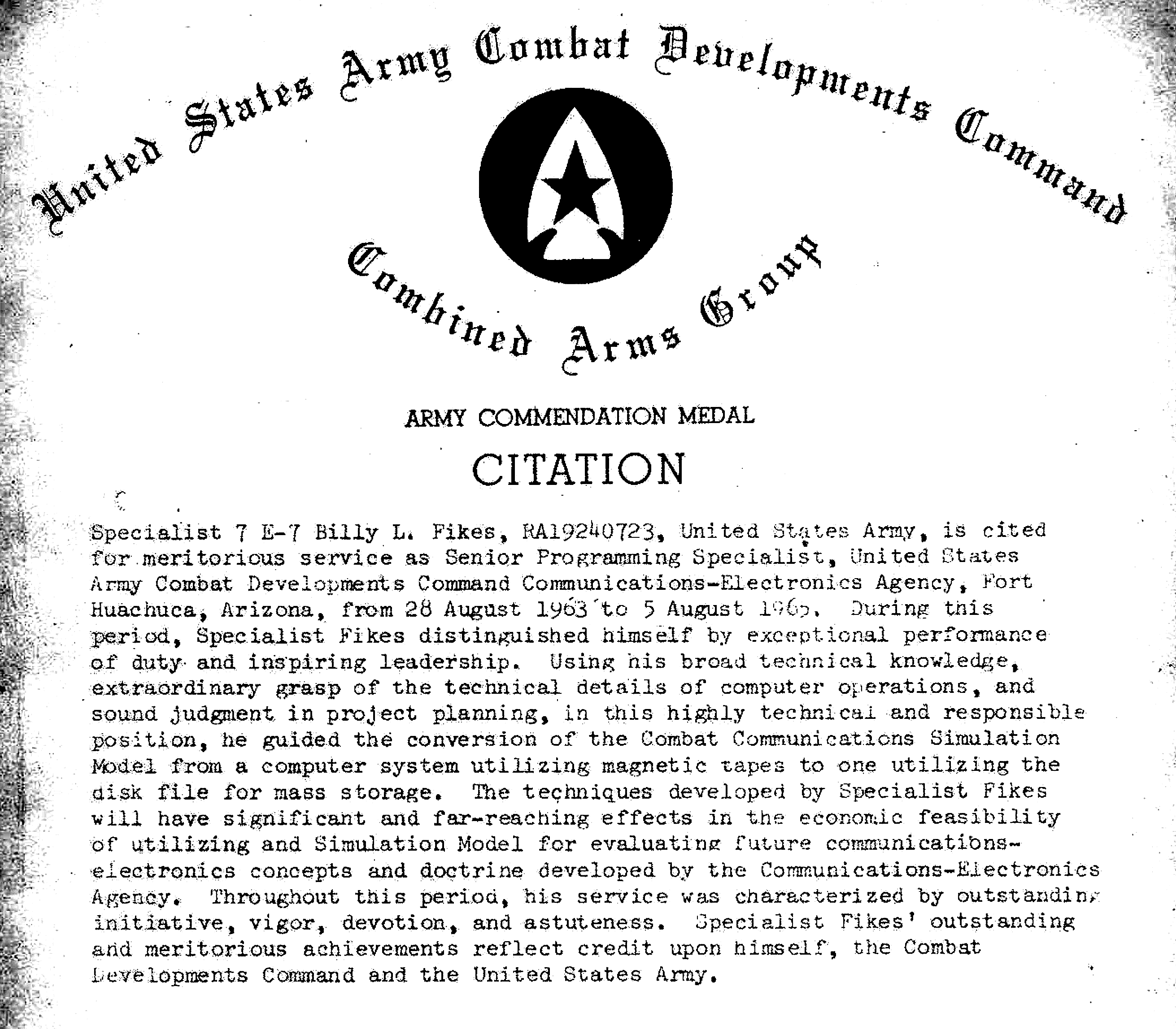 The US Army gave him a medal for the work he was doing, only it was a secret too and I was to find out later that it was read into the congressional record in a closed session of Congress. It seems he wrote a computer program that reduced “war game” simulation from days to simulate one hour of real time down to a few hours for one real time hour. A very major advance in the reduction of time needed on the worlds most sophisticated computers when there were not that many around. His advancements led directly to our ability to have first person, real time computer simulations.