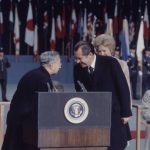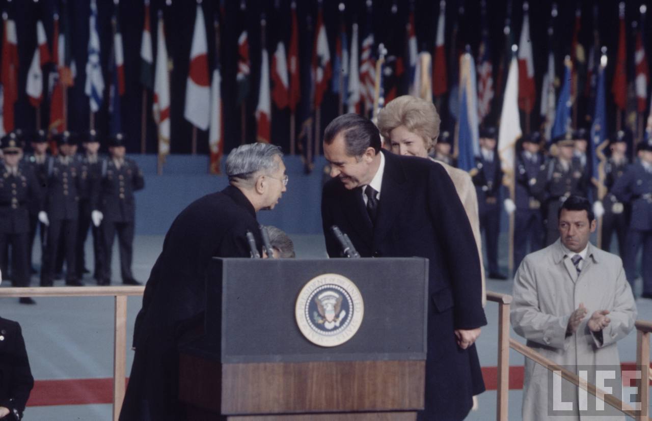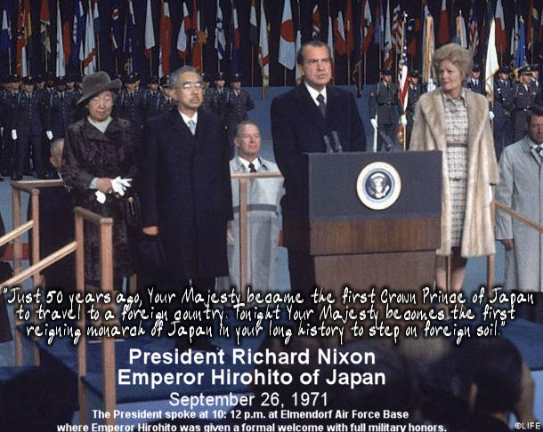 I remember watching Air Force One land, seeing President and Mrs. Nixon walk down the stairs and into the hanger and up on the raised podium. And then Emperor Hirohito the Empress came up and they exchanged greetings.